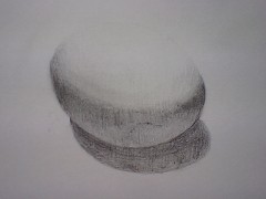 最も気になるのが周囲の「輪郭線」です。 もう少し幅でもあればいいのですがこのままでは奥行き(回り込み)の表現にマイナスになります。 影(投影)の上から右にかけても輪郭がクッキリしすぎでしょう。