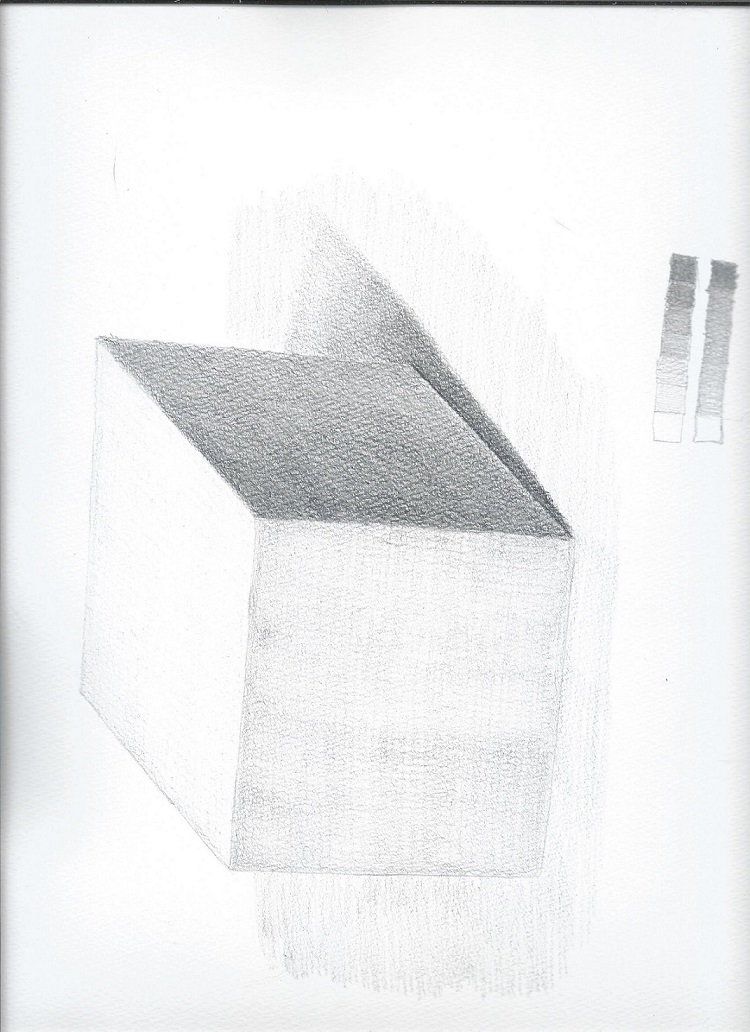先生こんにちは! 今回も立方体を描きました。過去のログを読んで、影のつけ方と塗り方を変えました。今までは鉛筆を寝かせて塗っていたのですが、立てて線を重ねるように塗りました。 何回も描いているせいで形が合っているのかどうかわからなくなってしまったことと、塗りはこれでよいのかどうかが分からなくなりました。