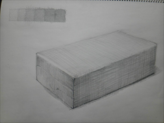 それから、クロスハッチングで長方形を塗るときの基本は 縦横(+方向)と斜め(×方向)の4方向のハッチングを重ねます。 このとき×方向より+方向のタッチが心もち強くなるようにしましょう。 (+方向のタッチは「面の方向」を表現するタッチだからです)