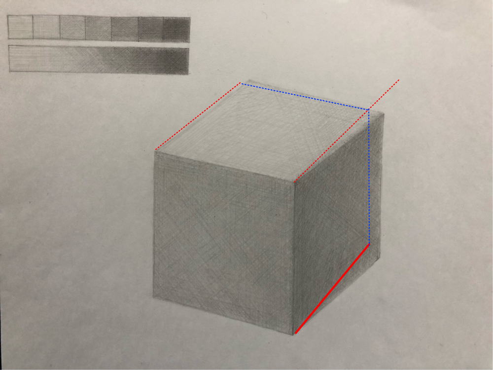 方向ですが、おっしゃるように左右対称になってしまいました。 そのため三つの面が同じ形の菱形になっています。 デッサンには「変化をつける」「差(違い)を発見する」というポイントがあります。 3面を違うトーンで塗る(そういう光の設定をする)のも同様ですね。 「同じものでも変えて描く」くらいの気持ちでやってください。