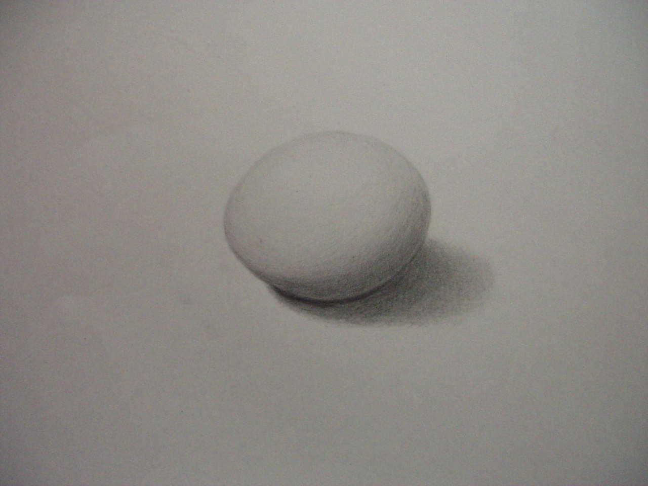 モチーフを見ながら描きましょう。 まずは形が問題です。卵は回転軸対象形になります、注意してください。 影はもう少し奥のほうにずらしてください。 |