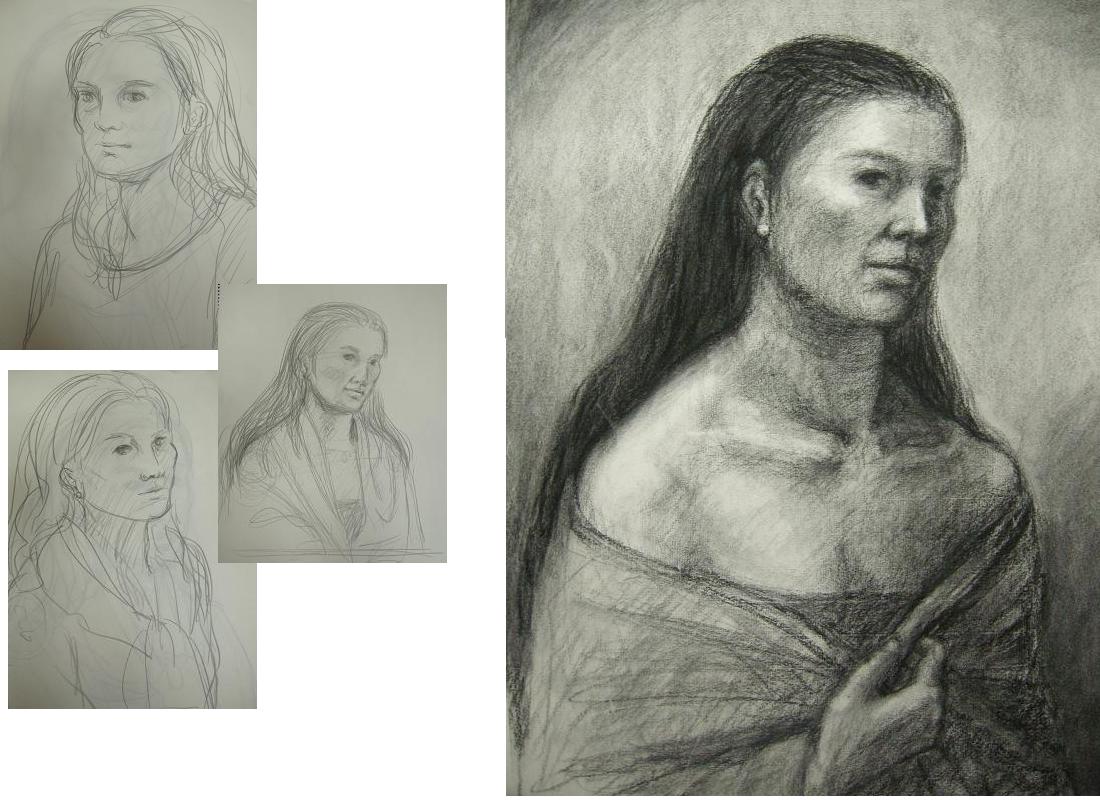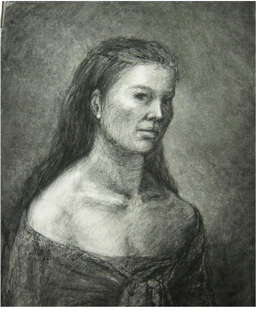 たとえば木炭画のほう、顔面や体の明暗(光の方向)はしっかり意識していますが