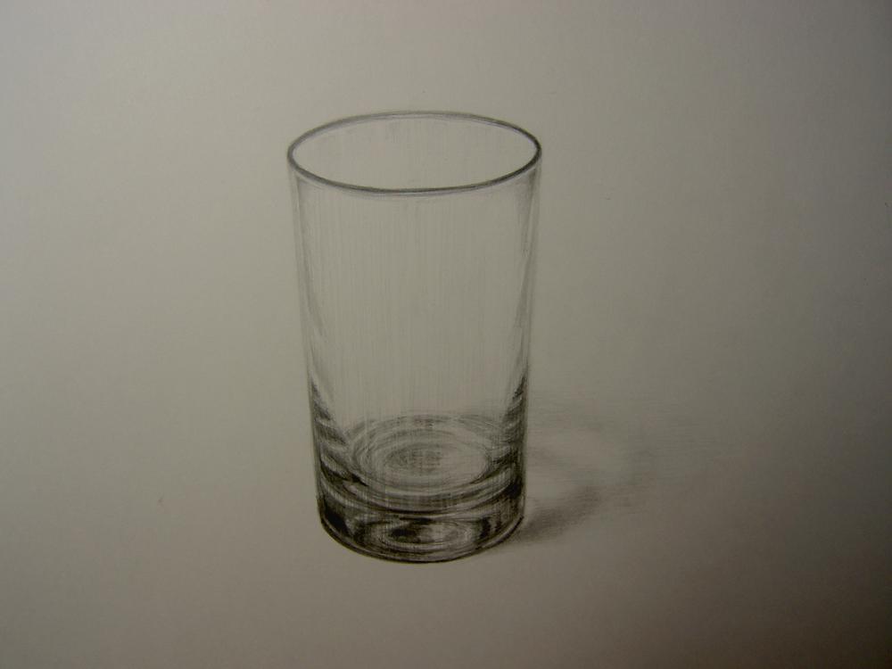 コップの側面、底面、厚みの部分の明度、上の縁の遠近感、ガラス側面の厚みの表現(中央部との差)など、まだまだ自分でも納得できる状態ではないのですが、工夫してみました。鉛筆は前回までは大半をHBで描いていたのですが、今回はHをかなり使いました。ご指導どうぞよろしくお願いいたします。