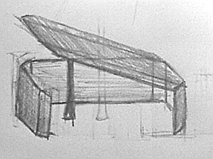 今エスキースしました。 上がった屋根を強調するために下の形をシンプルにし、 2枚目の屋根も省き、柱も中に立てました。 エスキースですが見て下さい。 |