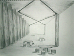 空間が四角形(直方体)ですね。ただの「箱」ではだめなのです。バス停の時も同じことを書きましたが、いちばん肝心なところですよ。 天井の「線」も意味不明です。早く立体(空間)構成の「狙い」の基本を理解してください。 |