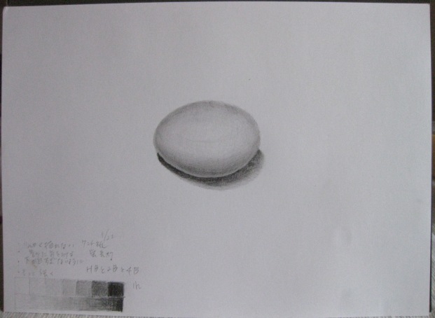 上記に気をつけて描いてみましたが、方向性としては、今の描き方で大丈夫でしょうか? 卵は、もう少し強く(最暗部はもっと濃く)がいいのでしょうか?